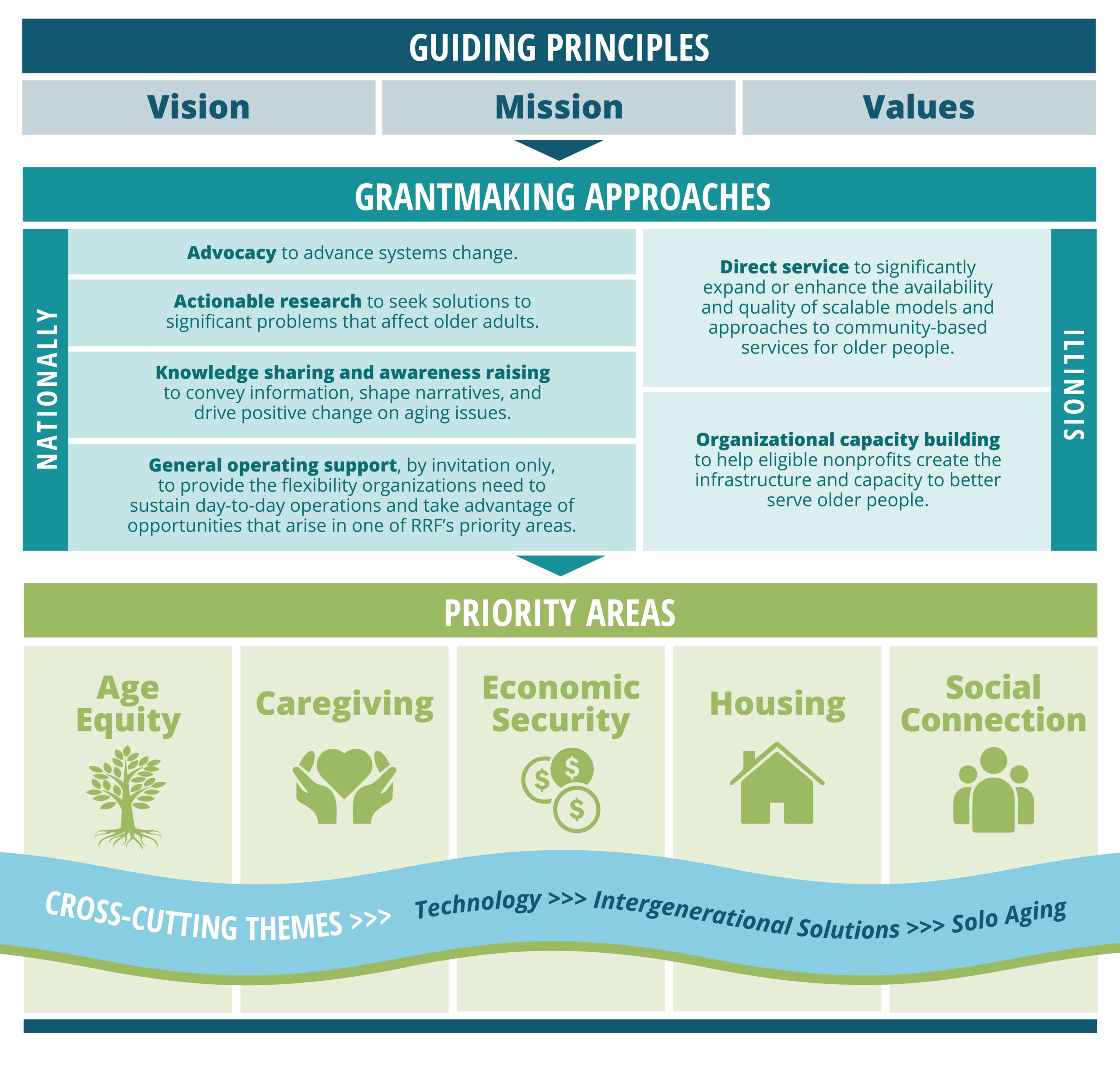 As part of a new strategic plan, key goals have been identified to guide RRF’s work and its ongoing commitment to aging philanthropy. Moving forward, RRF will: